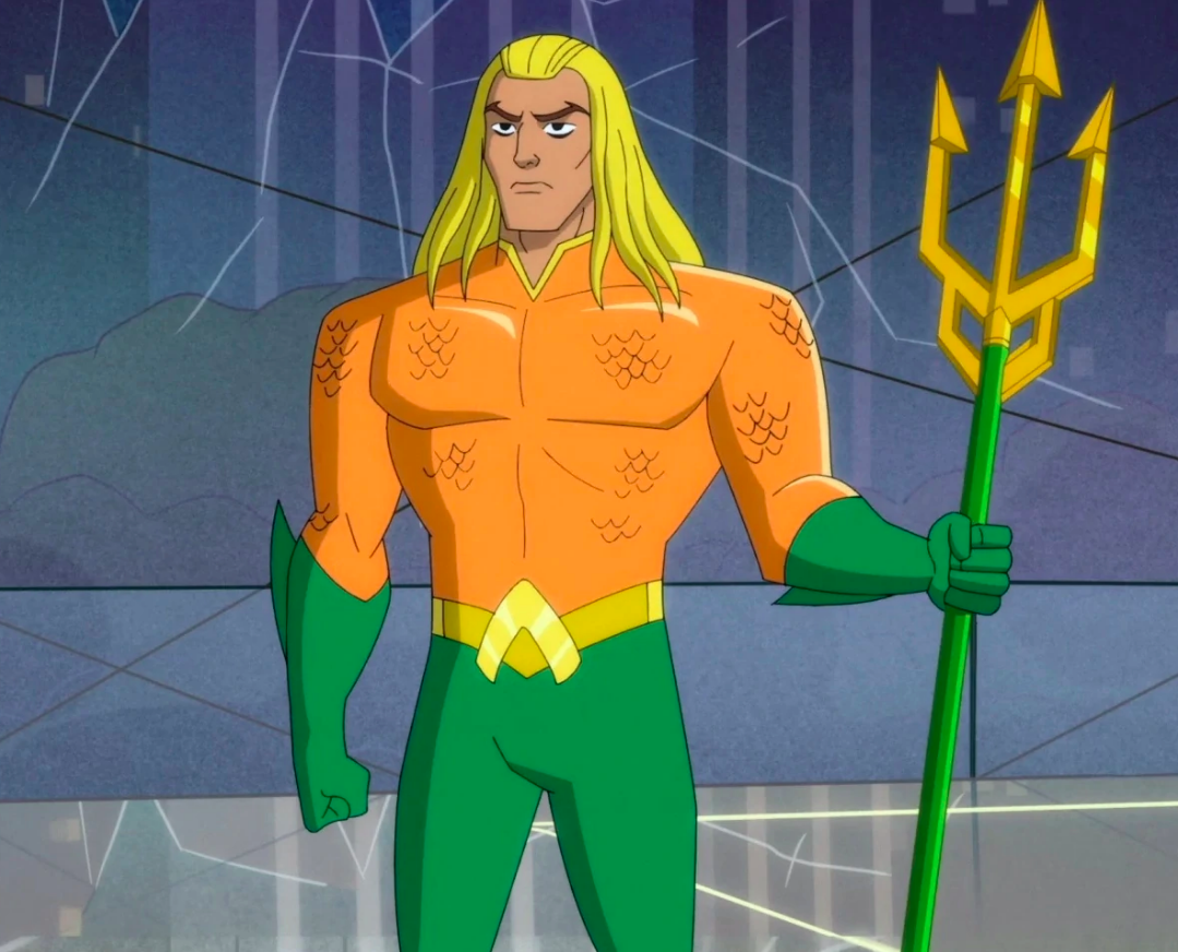 Eschewing the tattoos and beard of Jason Momoa, Harley Quinn offers a more classic take on Aquaman, although he does have longer hair than the modern incarnation. He is golden blond, with slightly tanned skin, and is wearing an orange scale-mail shirt that ends in a Mandarin collar around his neck. His hands are covered by a pair of forest-green gloves with a fin around the sides. He also sports a pair of forest-green pants held by a golden yellow belt with a golden belt buckle shaped as a stylized letter A.