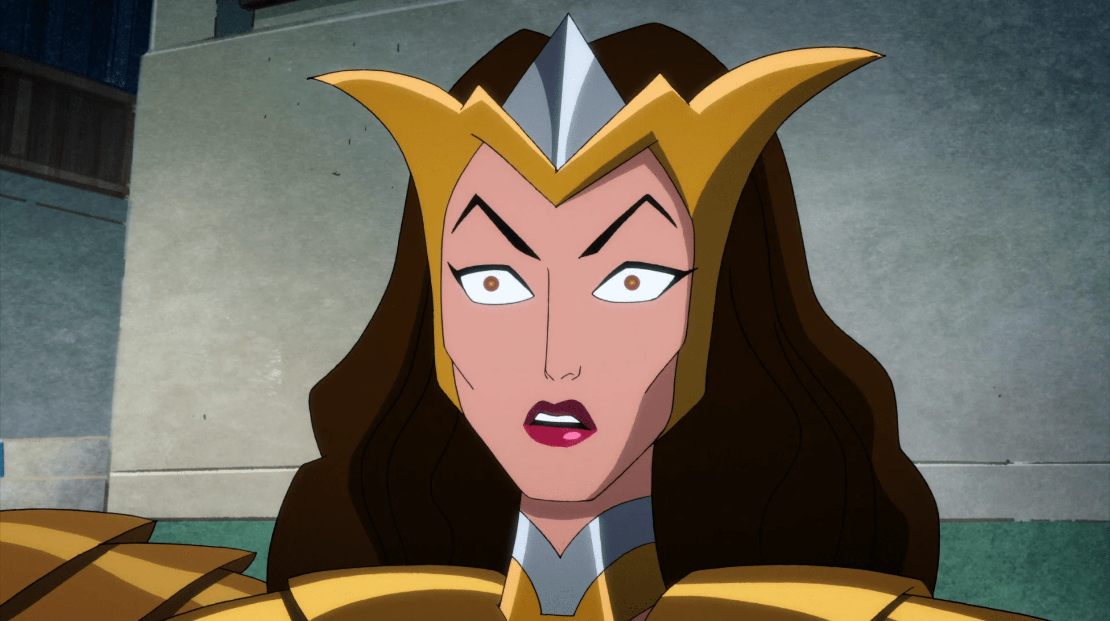 Poison Ivy and co burst into the room just before Queen Hippolyta can sign a contract unifying Themyscira with LexCorp. Ivy takes a moment to show off her brand new "Cobb Squad" tattoo, but everyone around her looks away bashfully as she realizes that no one else got matching tattoos. To avoid explaining, Jennifer wades into battle with her broadsword, butchering Amazonian guards while Ivy attacks them with vines and Harley bludgeons another with her bat. Eris ends up getting hit "in the tit" with a vase, so she urges Queen Hippolyta to sign the contract quickly.