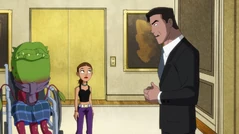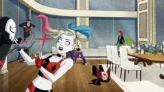 After Shaun breaks a very expensive showerhead, Harley calls Bruce to ask for a replacement and invites her and Ivy to a pasta dinner party at his penthouse. That night, Harley and Ivy show up with Shaun and Frank (Who is going through a late-life crisis after realizing he's 90 in plant years), and they are greeted by Lois who shares an apartment in the building with Superman who got it as a birthday present from Bruce. Suddenly, Joker makes a fashionable entrance with his stepdaughter Sophia. Bruce is taken aback to see him, and Joker explains that his lady Bethany has a place here for Sophia, who has an internship at Wayne Industries. Bruce steps aside for a phone call, only to reveal that Lena won’t join them for the night and is disappointed. Damian adds that Raven isn’t coming either but won’t elaborate. Alfred, who is out on parole, arrives and tells everyone dinner is served.