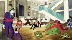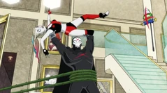 As the fight ensues the intruder starts attacking everyone, as Lois, Shaun and Frank are trap by red X shaped restraints, Joker protects Sophia with exploding chattering teeth while Ivy, Bruce and Damian help Harley fight the intruder who starts using razor sharp X shaped weaponry. When the fight leads to the kitchen, the intruder removes his skull mask and reveals himself to be Dick Grayson who was resurrected by the power of the Lazarus Pits and now wanted revenge on Harley for sleep killing him. As Dick is about to stab Harley, Bruce yells out he is sorry for not being there for him and Damian and not opening up until now. After a heartfelt conversation, Dick lets go of his rage and agrees to start fresh with Bruce and Damian, then all three embrace.