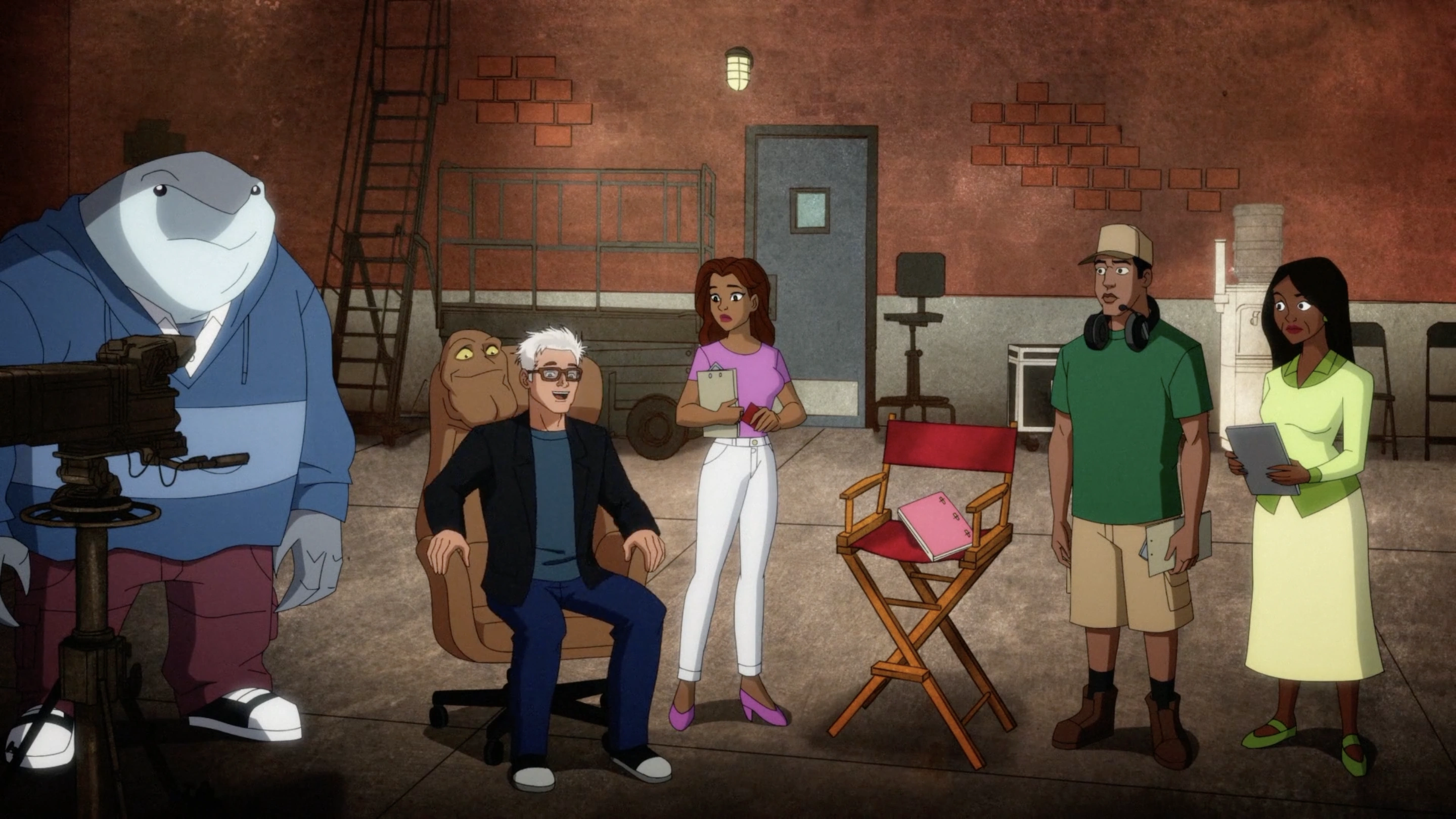 Back in Gotham, King Shark is helping Clayface to prepare for his audition... at the place of the audition as the crew are watching. He begins his audition, but James Gunn, the director, is unimpressed and thanks him for coming. Clayface begs for another chance, showing off his talents by shifting into multiple characters while Gunn looks away. As Clayface starts to leave, disappointed, Gunn starts complaining about his uncomfortable chair. Clayface then turns himself into a chair and asks James Gunn to sit on him, which he does. Pleased with the comfortable chair, he offers Clayface a job as the director's chair.