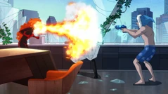 Trying to die looking like supermodels, Nora shows Cold and Shark, where the beauty products and other misc. items were held, and Cold states that's where Volcana was. Right after Cold mentions this, Volcana falls out of one of the lockers Cold put her in. Volcana, who wore a gas mask, thanks them for letting her out but scolds Cold for locking her in a locker, which Cold downplays, stating that at least she is alive. Now, with gas masks and armed with several flammable items that could create an explosion, Nora gets an idea.