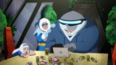 Shark continues hacking into the LOD terminal, noting that it is his time to shine, while Cold massages his neck and notes how he is learning so much from watching Shark. Lamenting Cold and Shark's bonding over their tech interests, Nora finds the "Imbigulator" and intends to use it to make the building bigger and the armor pop off. However, Shark asks for a few minutes to work his magic; even so, Nora fires the gun off anyway, causing Shark's hands to grow in size, and she realizes the gun was single use only.