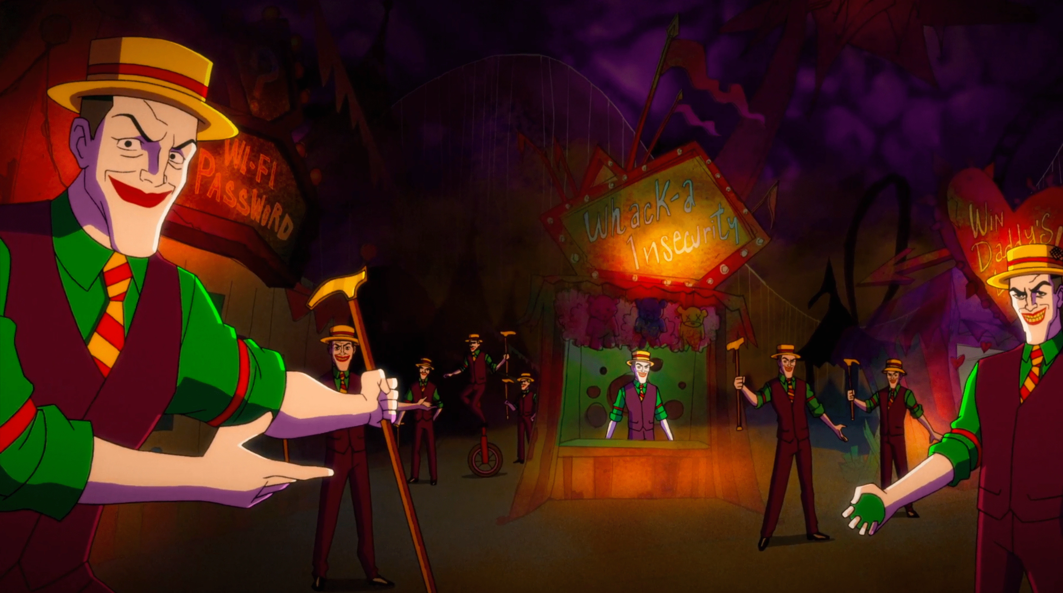 The Joker, while not physically present, was still seen throughout Harley Quinn's subconscious when Harley's crew entered her mind. Dozens of clones of the Joker littered the circus landscape, welcoming people or running carnival games. One Joker even pointed out that Harley was still clearly obsessed with him and offered her a chance to "Win Daddy's Love" in a game of skill. Before they could be interacted with further, several Harley Gremlins arrived and forced them to leave the area and the Jokers behind.