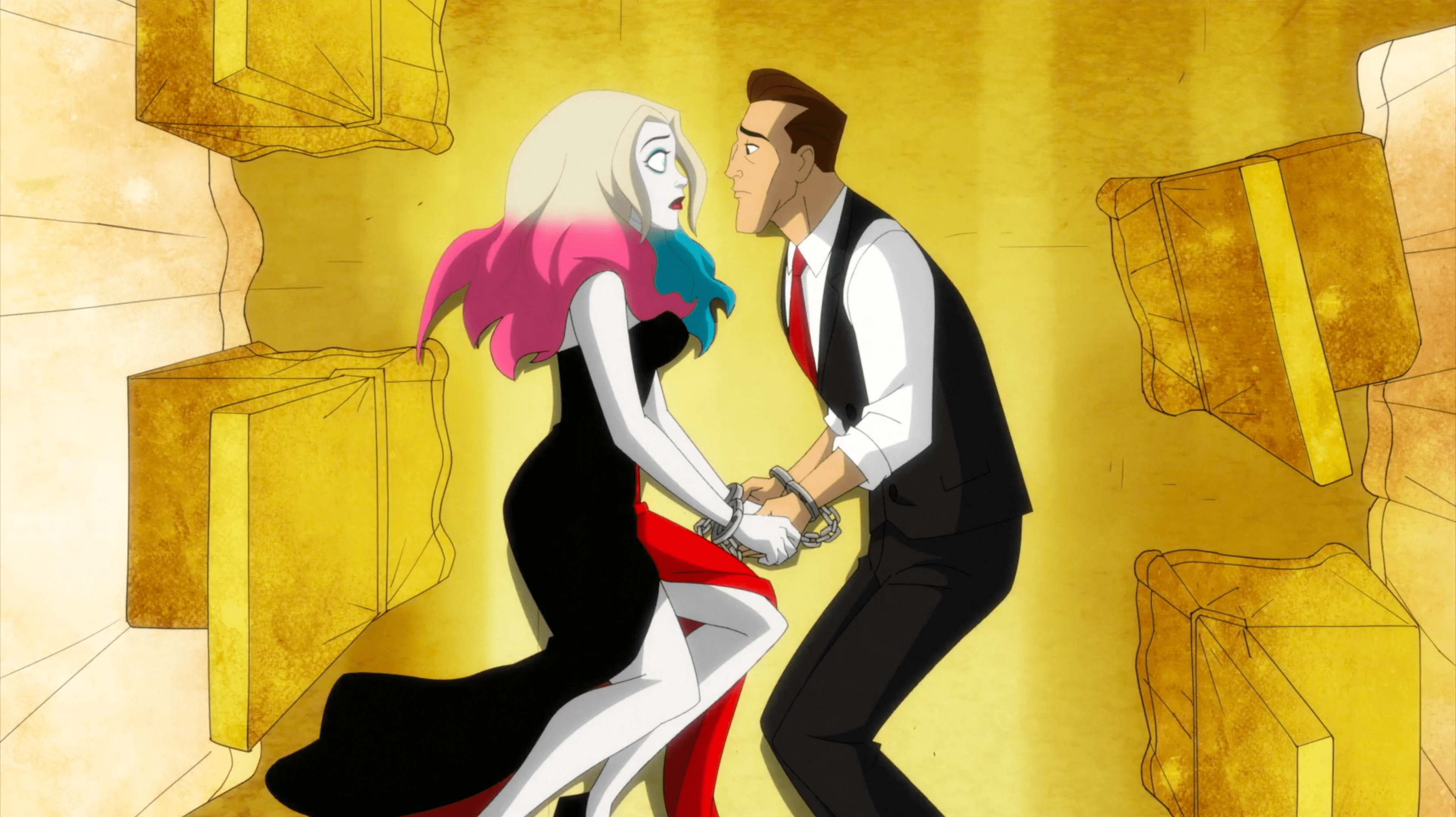 They eventually ended up on a commandeered yacht much like the one in "Til Death Do Us Part", drinking wine in a romantic setting with the previous owners tied up beside them. When one of the owners commented on how they were eating, the Joker and Harley threw them overboard onto a life raft, laughing together. Harley also gave him suggestion that he has his tower shoot up from underground to scare people "like a jack-in-the-box", which the Joker was unusually receptive to. Harley was surprised and pleased by this, which the Joker brushed off as her becoming "another master". However, he couldn't quite agree that she was "the master", and insisted that the phrase was "the student becomes a master equal to the original master, but not with more mastery than that master". Even so, Harley took this to mean that the Joker was now ok with her leaving him, and he claimed that he wished she had become independent sooner.