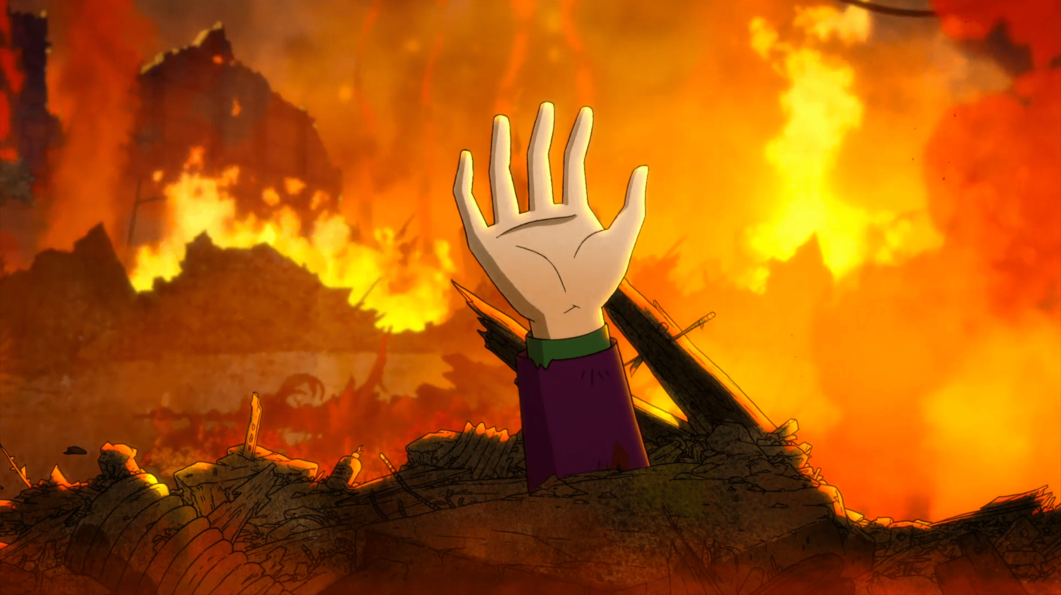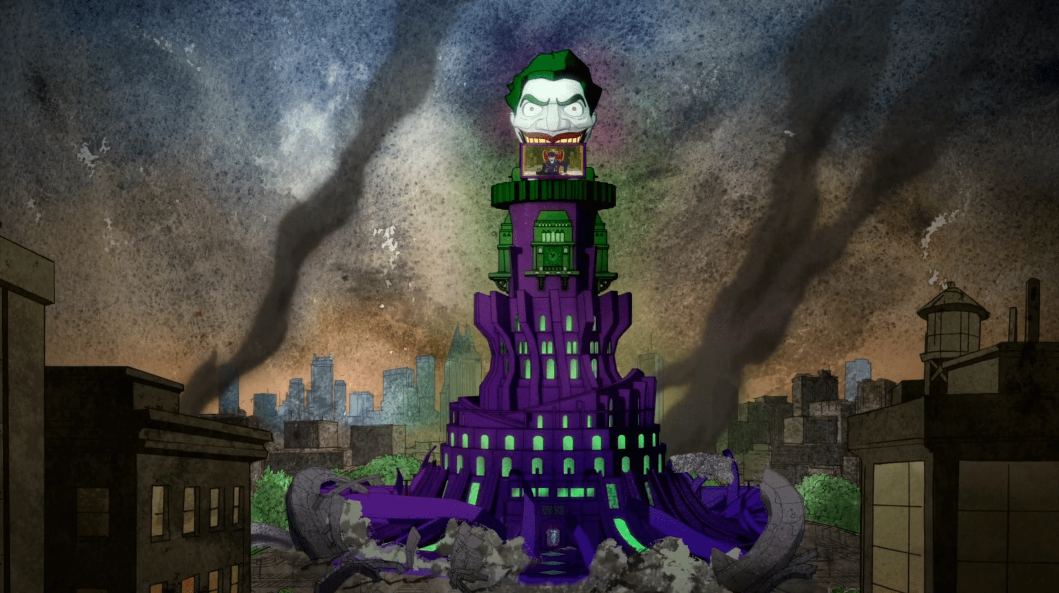The Joker's new tower amidst the ruins of the Legion of Doom