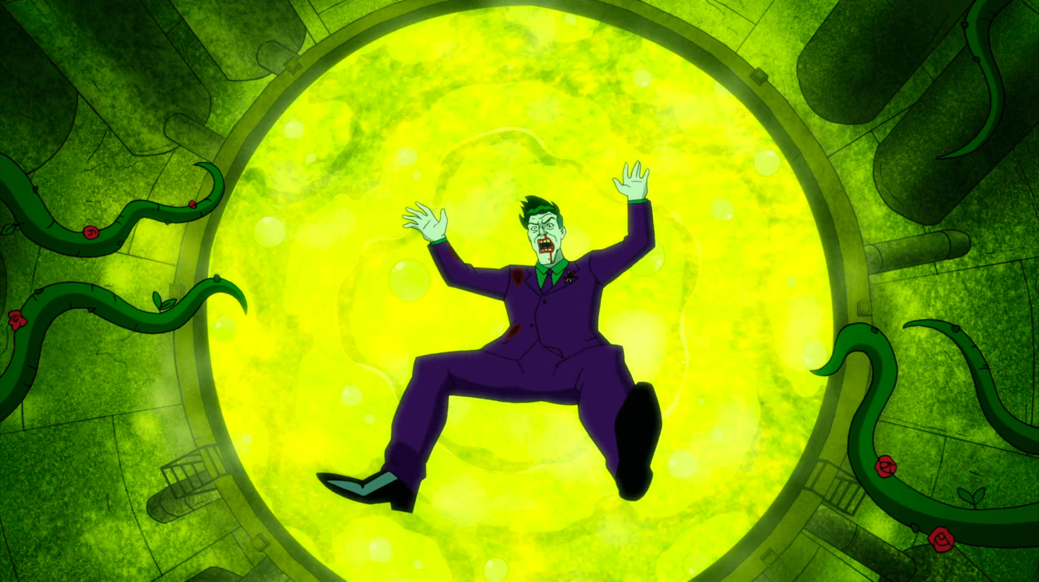 At last, the Joker brought Harley again a vat of chemicals, intended to wipe away her memory and leave her as a "nobody. A blank canvas. A stranger on the streets. Normal". He blamed her for "making me fall in love with you" and assured her that she wouldn't remember a thing. However, Harley suddenly requested that she jump on her own, which the Joker found amusing and easily allowed, to his regret. He walked away after she jumped, but neither he nor his bodyguards heard any splash, at which point Harley and Poison Ivy rose above the catwalk. He immediately regretted not harpooning Ivy in the head and tried to flee after Ivy dispatched his bodyguards, but Ivy's vines were too fast, and he was captured. Although he tried to talk his way out, Ivy forced him to endure Harley's gloating and then dropped him into the chemicals.