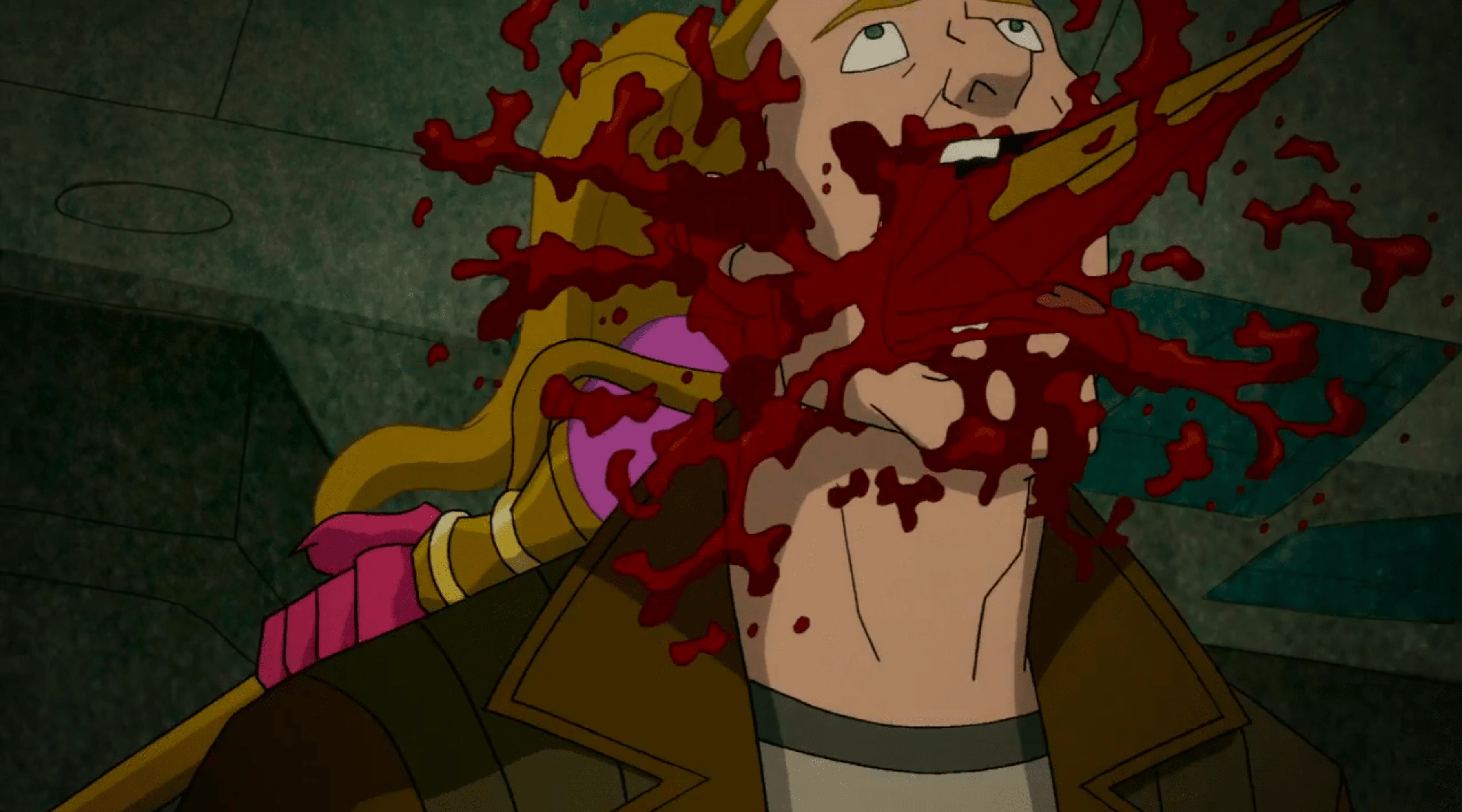 Ivy apologizes to Kite Man, but he is surprisingly forgiving, saying he cares about her, and Ivy says she likes him too, "against all logic and reason". Again, back at the Gotham Mall, Jason Praxis launches a powerful bolt at Queen of Fables, only for it to rebound and strike him instead - Harley puts her personal force field on Queen of Fables, saving her. Harley then sent Queen of Fables away, although she warned Harley for leaving her alive; at this point, Jason began to wake up. When he came to, he asked if he "vanquished" Queen of Fables and avenged his family, and when Harley lied that he did, he became overcome with emotion. He cried tears of relief, saying he could finally rebuild his life, only to be interrupted when Queen of Fables' spear erupted from his mouth - she stabbed and killed him from behind, finally "ending the bloodline".